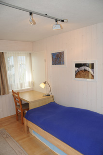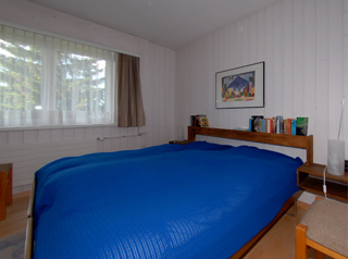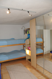 Im Kinderzimmer gibt es ein Einzel- sowie ein Kajütenbett. Ein grosser Spiegelschrank gibt dem Raum Weite. Wer sich in Ruhe zurückziehen will, findet hier auch einen kleinen Schreibtisch. |